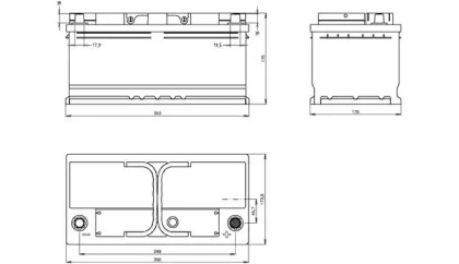 Battery Brand: EXIDE Battery Code: EB950 Voltage: 12 V Battery Capacity: 95 AH Cold Cranking Amps (CCA): 800 A Length: 353 Width: 175 Height: 190 Post Positions: 0 Terminal Type: EN Hold-down Type: B13 | |